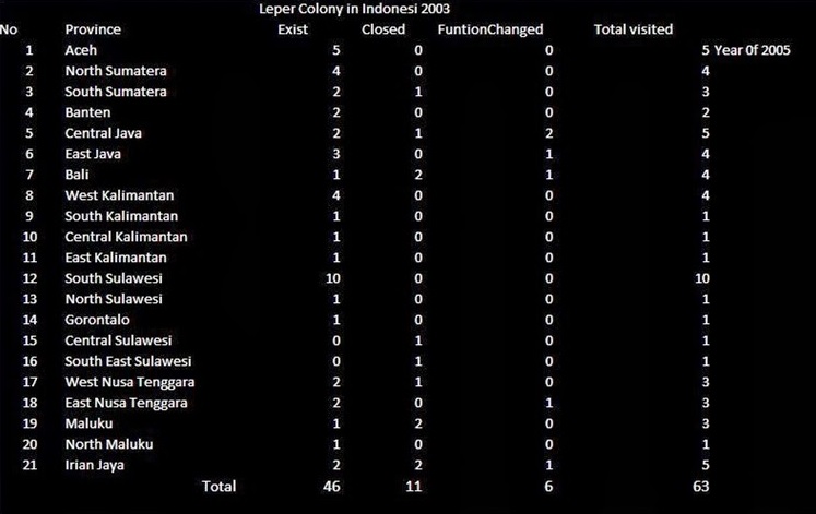 Dari total 63 koloni kusta dikunjungi, ditemukan bahwa 6 tidak bisa dikategorikan sebagai koloni kusta (perubahan fungsi), 11 ditutup dan 46 masih eksis.